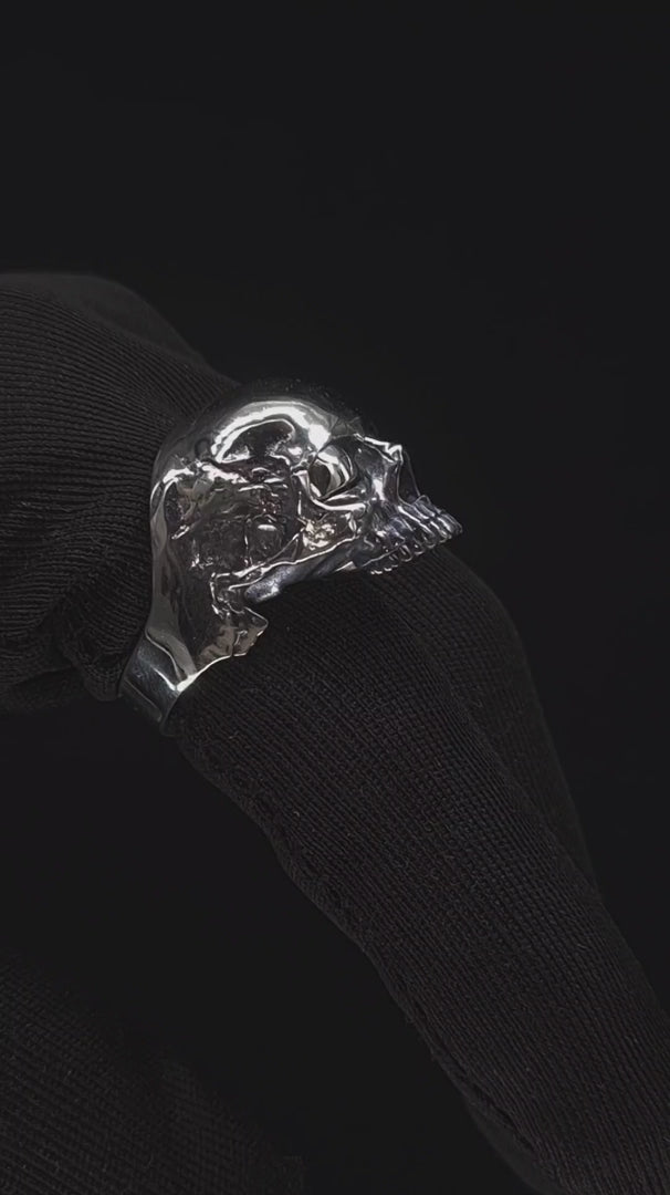 The Lenore Half-Jaw is crafted from high-quality .925 Sterling Silver. This ring features 5mm white brilliant crystal eyes set within the skull, with eyelids that captivatingly open and close with movement. The silver is artfully treated with an iridescent patina that gradients from the back to the sides of the skull, while the front is high-polished for a distinctive finish.
