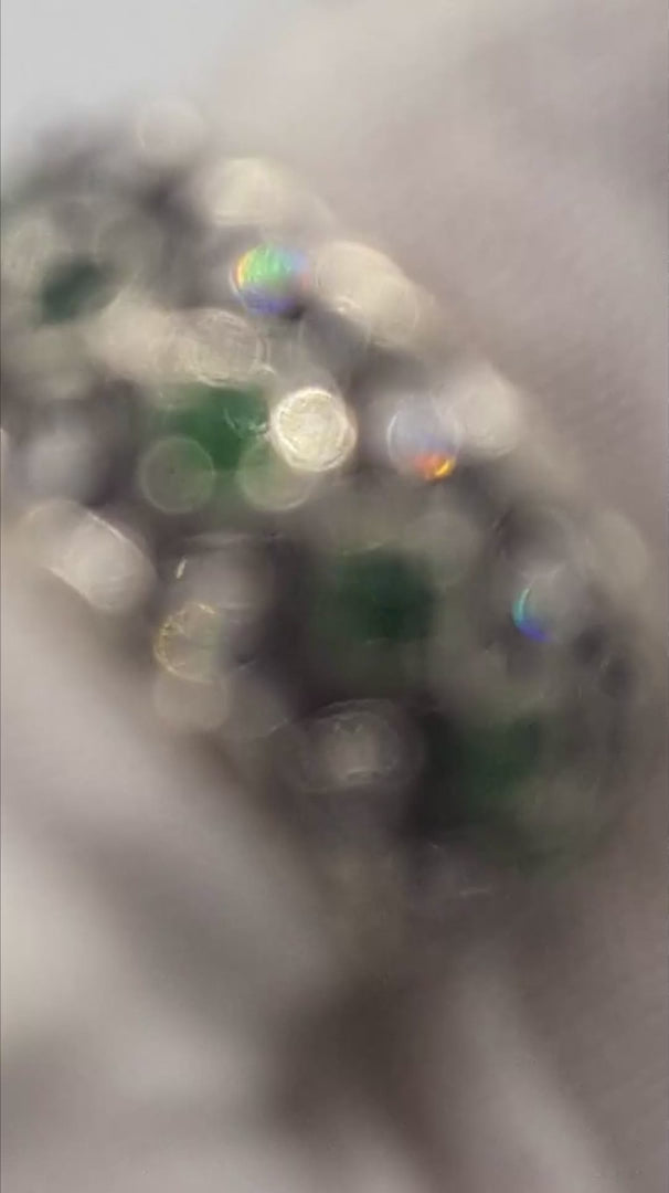 The Lilium .925 Sterling Silver ring boasts a stunning arrangement of 12 emeralds, each exuding impeccable brilliance and radiance, complemented by an additional 26 upside-down set CZ stones on the exterior.