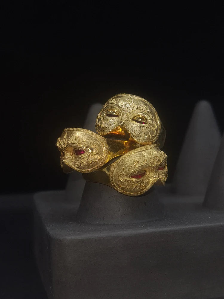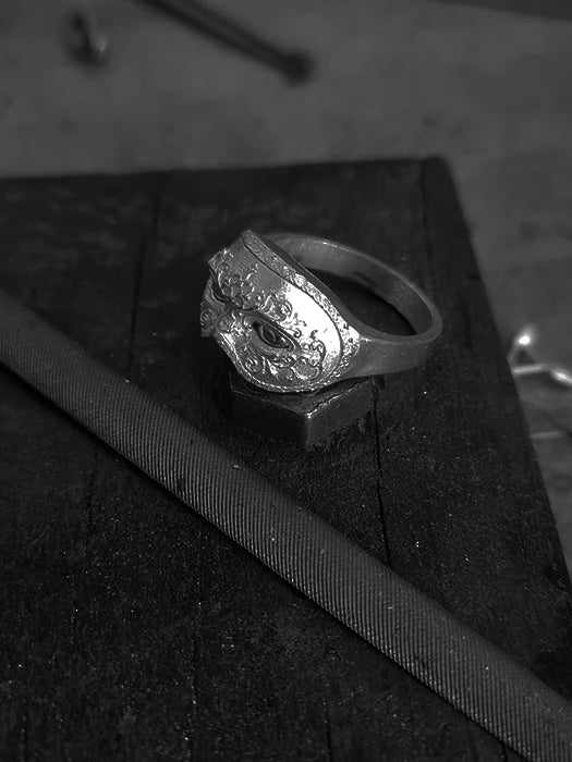 Inspired by the mysterious masks of the Venetian Carnival, Los Ocultos is a handcrafted statement ring that merges historical elegance with modern craftsmanship. Meticulously made from high-quality 925 sterling silver and plated in Rhodium, this baroque-style ring features a sculptural face framed by intricate eyelid mechanisms—My most advanced kinetic movement yet. The eyes are set with 4mm opals, lending an intensity to its gaze.