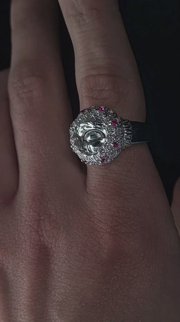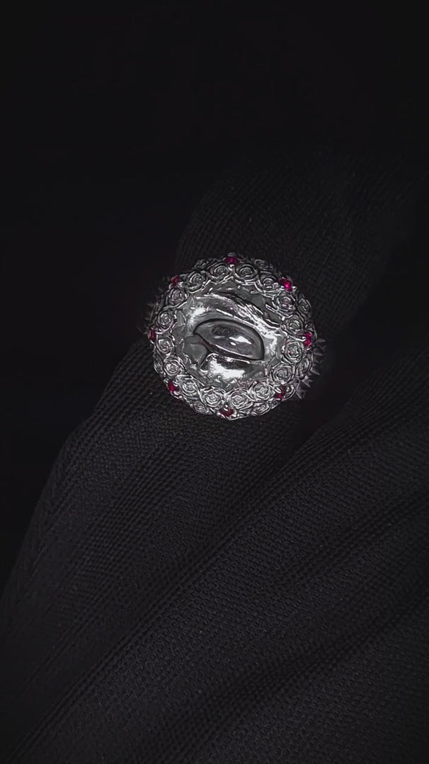 Crafted from premium .925 Sterling Silver, the Providentia ring boasts a centre stone nestled within the pupil, accompanied by rubies adorning the surrounding imbedded within roses. Notably, the eye exhibits an enchanting motion as the eyelids gracefully open and close in response to movement.